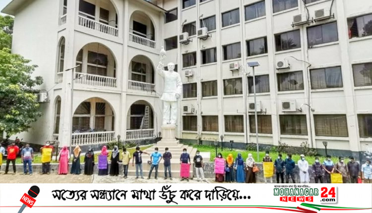 সোমবার (১৪ জুন) সকাল সাড়ে ১১টায় বঙ্গবন্ধু শেখ মুজিবুর রহমানের ভাস্কর্যের সামনে এ মানববন্ধন করে শিক্ষার্থীরা।
