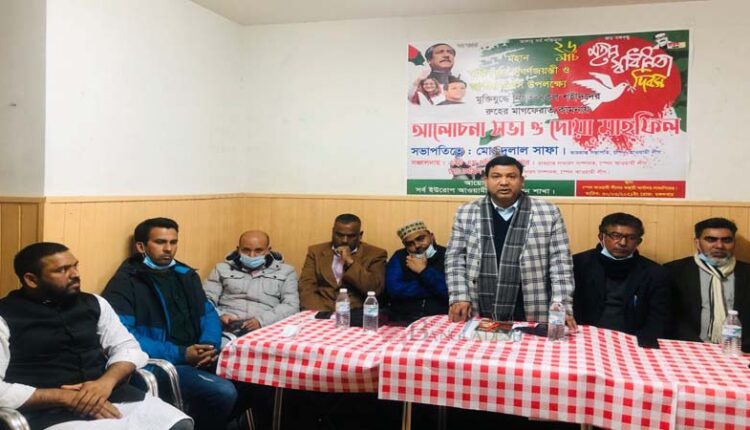 কবির আল মাহমুদ, স্পেন প্রতিনিধি: স্বাধীনতার সুবর্ণজয়ন্তী উপলক্ষে আওয়ামী লীগ স্পেন শাখার আয়োজনে আলোচনা সভা ও দোয়া মাহফিল অনুষ্ঠিত হয়েছে। মঙ্গলবার (৩০মার্চ) স্পেনের রাজধানী মাদ্রিদের একটি রেস্টুরেন্টে সংগঠনের ভারপ্রাপ্ত সভাপতি মোঃ দুলাল সাফার সভাপতিত্বে অনুষ্ঠান যৌথভাবে পরিচালনা করেন ভারপ্রাপ্ত সাধারণ সম্পাদক এইচ এম দবির তালুকদার ও যুগ্ম সম্পাদক জসিম উদ্দিন ব্যাপারী।