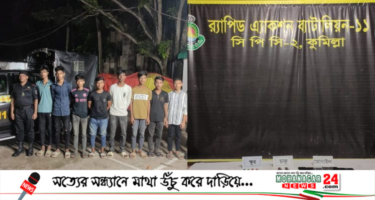 গত ২৭ জুন রাতে র‌্যাব-১১, সিপিসি-২ একটি বিশেষ আভিযানিক দল গোপন সংবাদের ভিত্তিতে কুমিল্লা জেলার কোতয়ালী মডেল থানাধীন দক্ষিণ মাঝিগাছা এলাকায় বিশেষ অভিযান পরিচালনা করে তাদেরকে আটক করা হয়। এসময় তাদের নিকট হতে ২ টি চাকু, ৪ টি ক্ষুর ও ৭ টি মোবাইল উদ্ধার করা হয়।