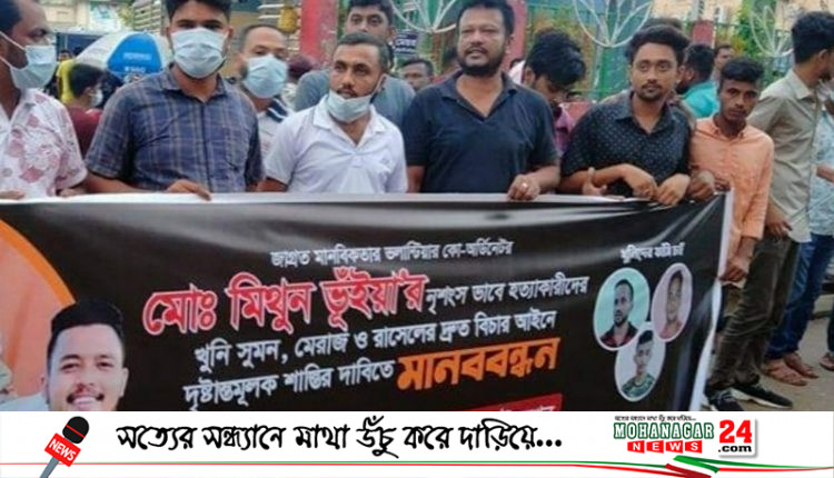 মাদক ব্যবসায়ীদের হাতে নিহত স্বেচ্ছাসেবী সংগঠন জাগ্রত মানবিকতার কো-অর্ডিনেটর মিথুন হত্যাকারীদের দ্রিত বিচার আইনে দৃষ্টান্তমূলক শাস্তির দাবীতে মানববন্ধন করেছে হিউম্যান রাইটস অব বাংলাদেশ ফাউন্ডেশন।