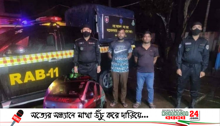কুমিল্লা চট্টগ্রাম-ঢাকা মহাসড়ক দিয়ে এ্যাম্বুলেন্সে করে রোগী পরিবহনের আড়ালে মাদকদ্রব্য পরিবহনের সময় দুইমাদক ব্যবসায়ীকে গ্রেফতার করে র্যাব-১১।