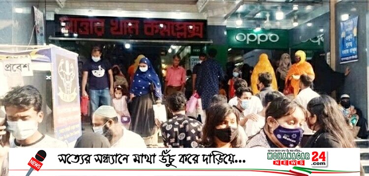 শহরে মধ্যবিত্তরা শপিং করছেন নিউ মার্কেটের নিচতলা ও ফুটপাতে। এসব স্থান ক্রেতায় পরিপূর্ণ। কান্দিরপাড় লির্বাটি সিনেমা হলের সামনে দোকানগুলোতে গায়ে গা লাগিয়ে কেনাকাটা করতে দেখা গেছে মানুষজনকে। ক্রেতা-বিক্রেতাদের অনেকের মুখে নেই মাস্ক। আবার কারো থাকলেও তা সঠিক নিয়মে পরা ছিল না।