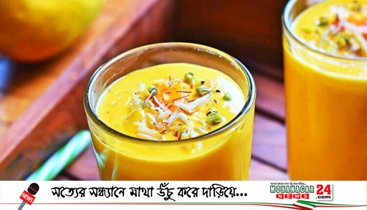 এক কাপ দই, এক কাপ ছোট ছোট করে কাটা পাকা আম, আধ কাপ দুধ, ৪ টেবিল চামচ চিনি এবং কিছু বরফ মিক্সারে মিশিয়ে নিন। পরিবেশন করার সময় উপরে কিছু আমের টুকরো, পুদিনা পাতা এবং অল্প দারুচিনিগুঁড়ো দিতে পারেন।