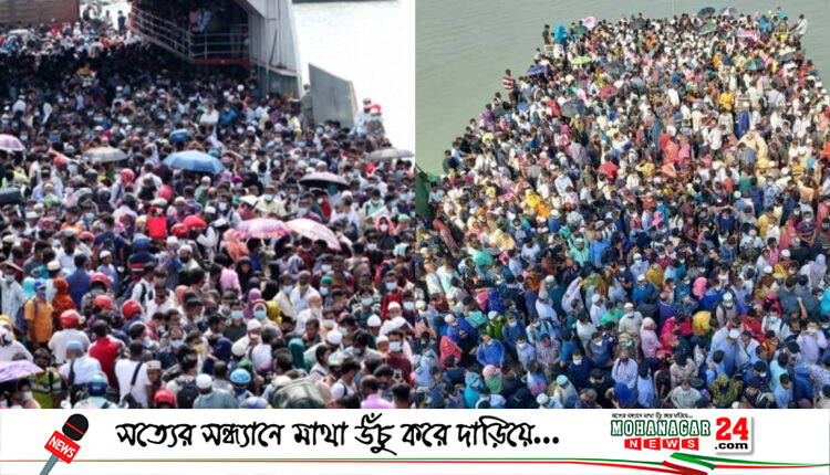 শুক্রবার (৭ মে) শিমুলিয়া ঘাটে ঠাসাঠাসি করে ফেরিতে নদী পার হতে দেখা যায় ঘরমুখী মানুষের।