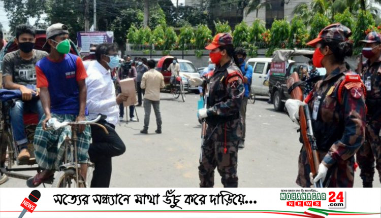 করোনাভাইরাস মহামারি নিয়ন্ত্রণে দেশে চলমান কঠোর লকডাউনে চলাচল নিয়ন্ত্রণের চেষ্টায় বিজিবি সদস্যরা।করোনাভাইরাস মহামারি নিয়ন্ত্রণে দেশে চলমান কঠোর লকডাউনে চলাচল নিয়ন্ত্রণের চেষ্টায় বিজিবি সদস্যরা।