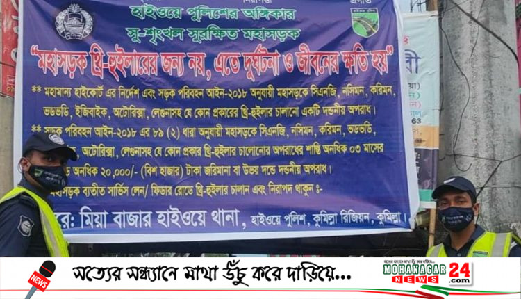 উচ্চ আদালতের নির্দেশনা বাস্তবায়নে সু-শৃঙ্খল ও সুরক্ষিত মহাসড়কের অঙ্গিকার নিয়ে ‘মহাসড়ক থ্রি হুইলারের জন্য নয়, এতে দূর্ঘটনা ও জীবনের ক্ষতি হয়’ প্রতিপাদ্যকে সামনে রেখে জনসচেতনতা সৃষ্টির লক্ষ্যে এবং থ্রি হুইলার চালক ও সাধারণ যাত্রীদের নিরুৎসাহিত করতে হাইওয়ে পুলিশের অতিরিক্ত আইজপি এর নির্দেশনায় কুমিল্লা জেলা পুলিশ সুপারের তত্ত্বাবধানে কুমিল্লার চৌদ্দগ্রামের মিয়াবাজার হাইওয়ে পুলিশের উদ্যোগে ঢাকা-চট্টগ্রাম মহাসড়কের সংযোগ সড়কের মাথায় এবং জনবহুল ও গুরত্বপূর্ণ স্থানে বুধবার (২০ অক্টোবর) বিকালে সচেতনতামূলক ব্যানার লাগানো হয়।